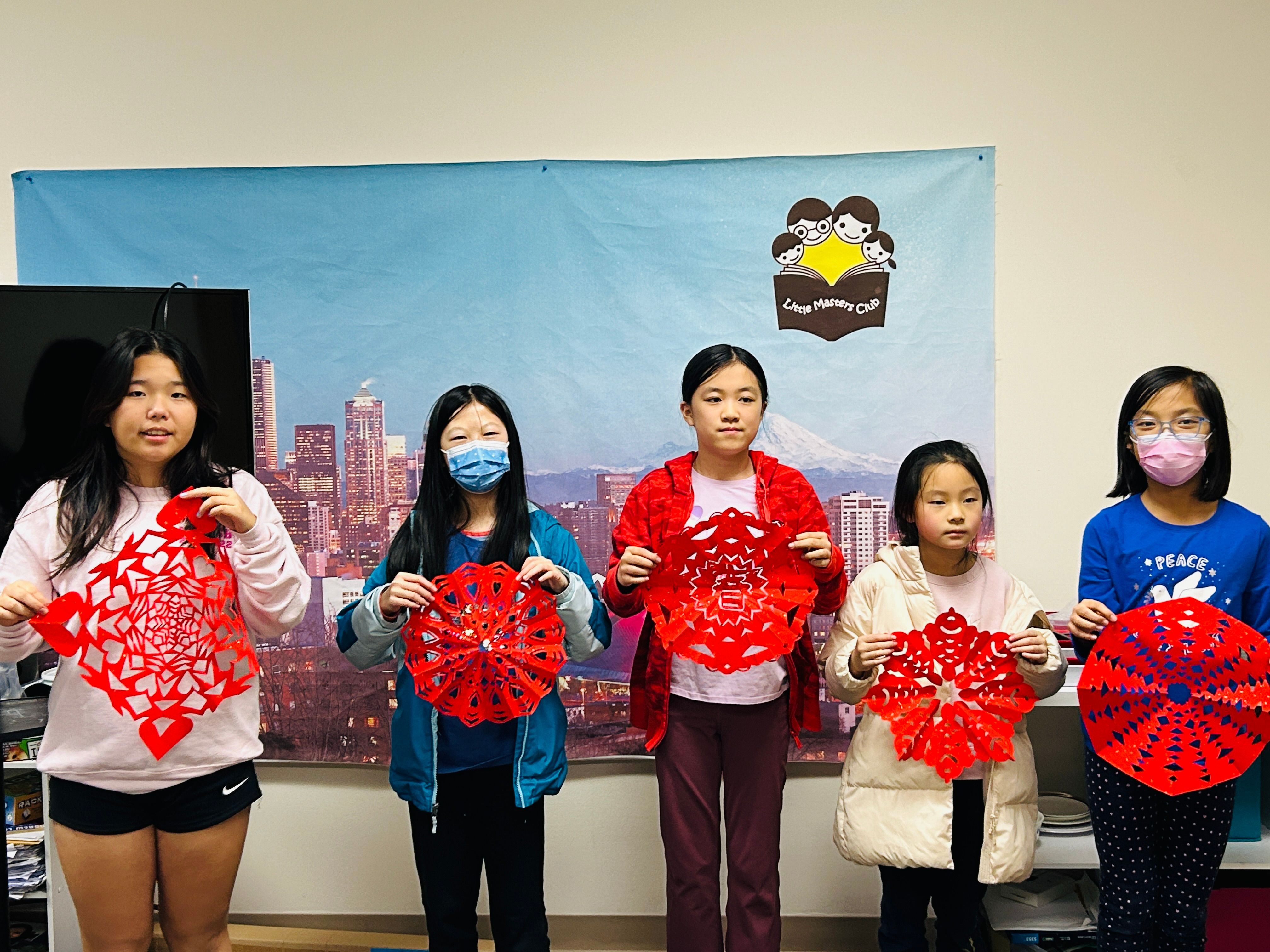 小大师艺术组的几位成员Cindy Ma, Serena Wang, Kaylee Hu, Haoling Yang, Jinyi Kou为老人院制作文化中国剪纸。